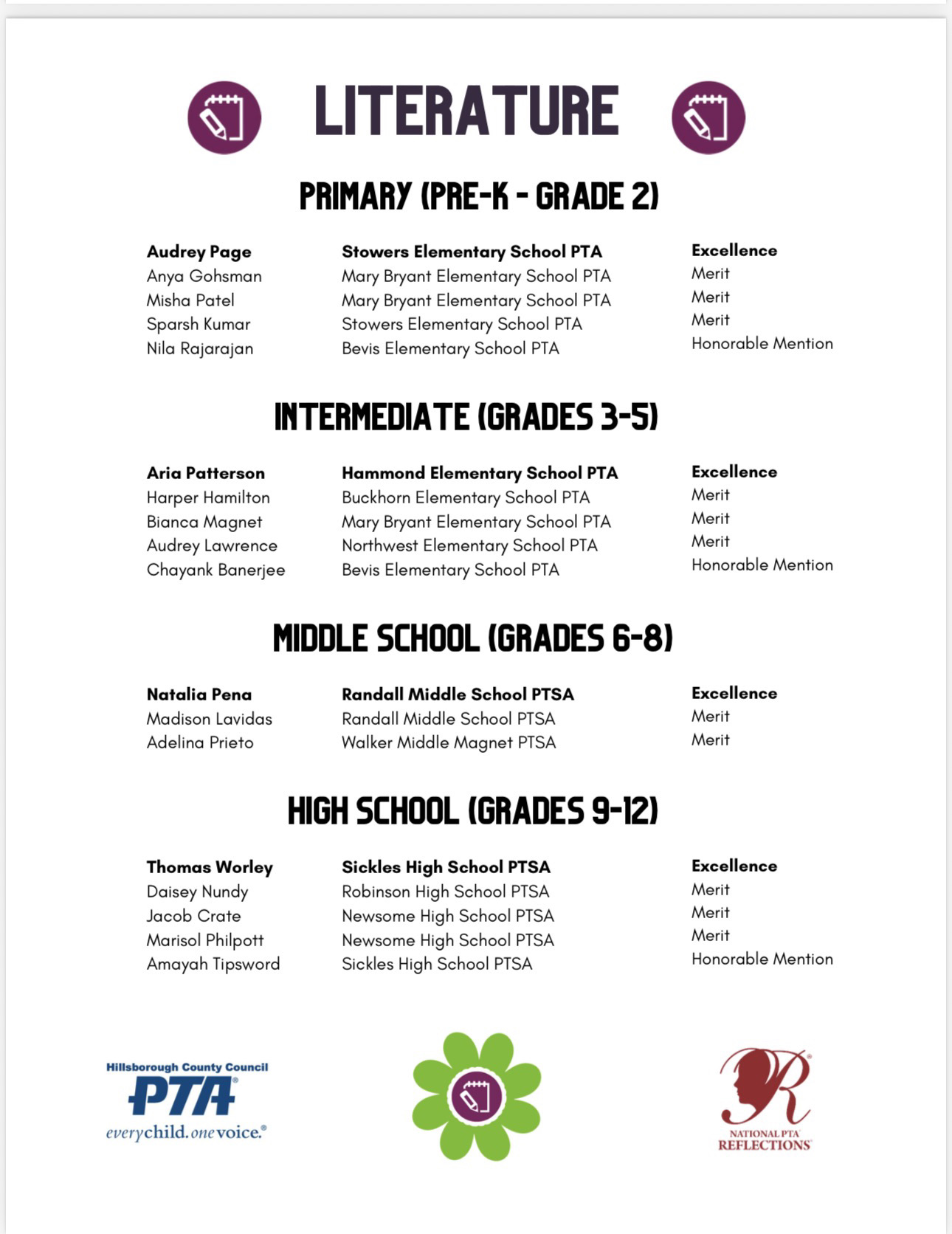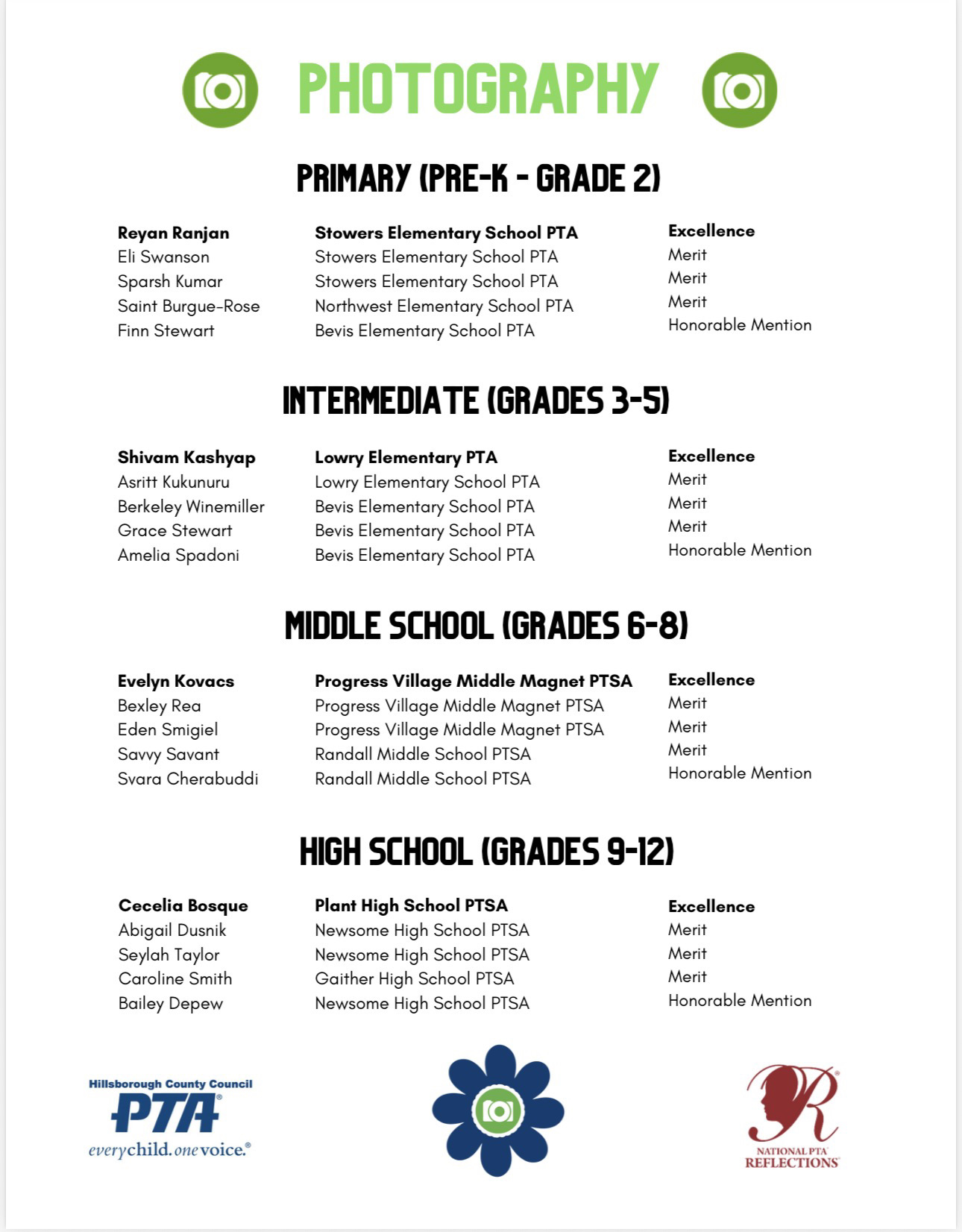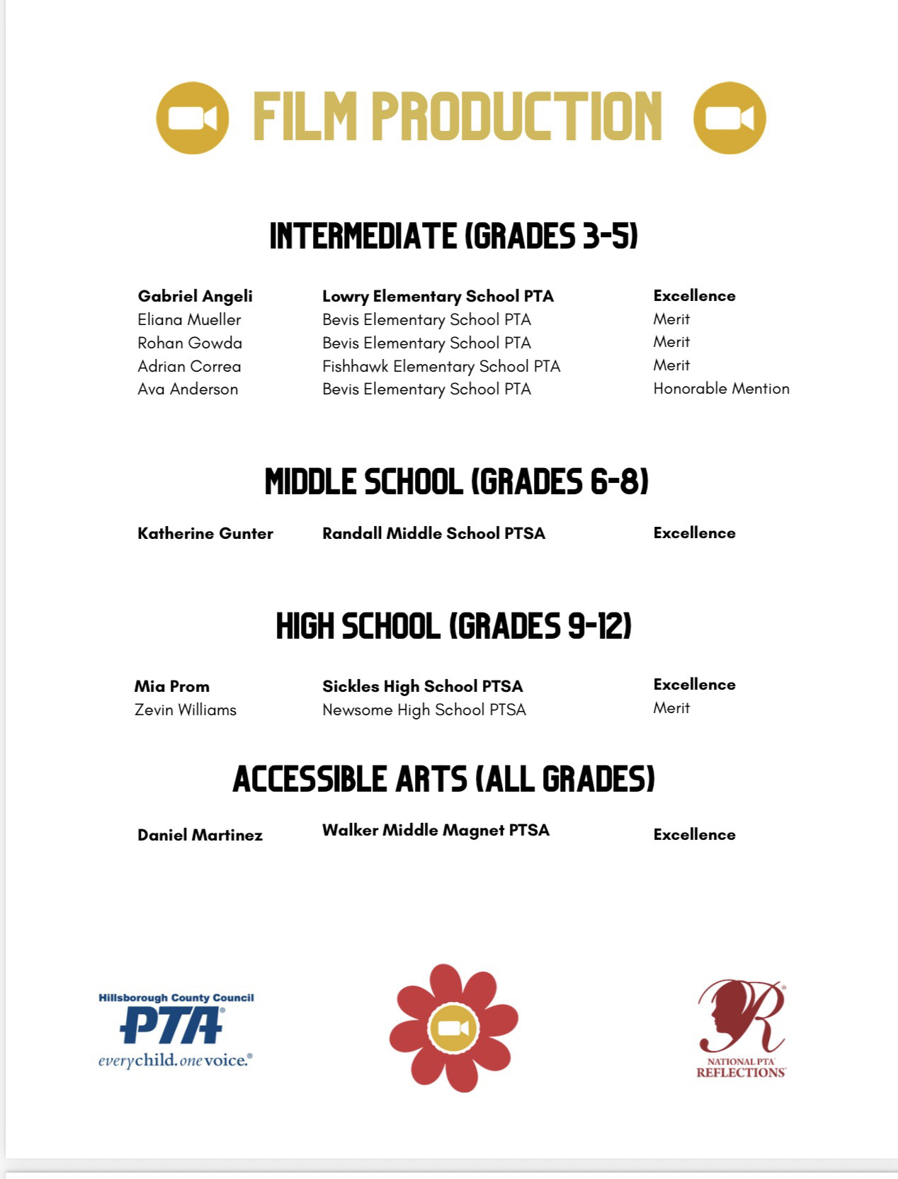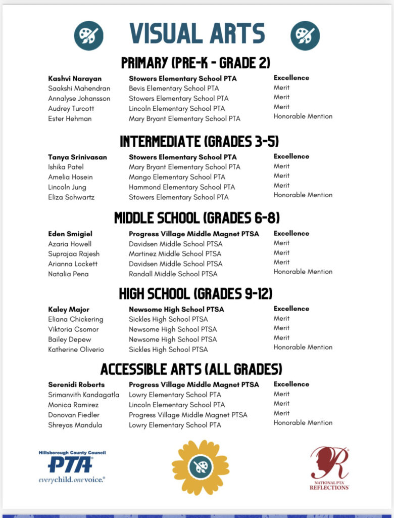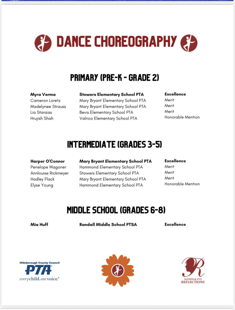 The Hillsborough County Reflections Committee has officially announced the county wide winners for 2025-2026! This year 13 Broncos were chosen as winners at the county level and several of them will move on to the STATE Reflections PTA competition!